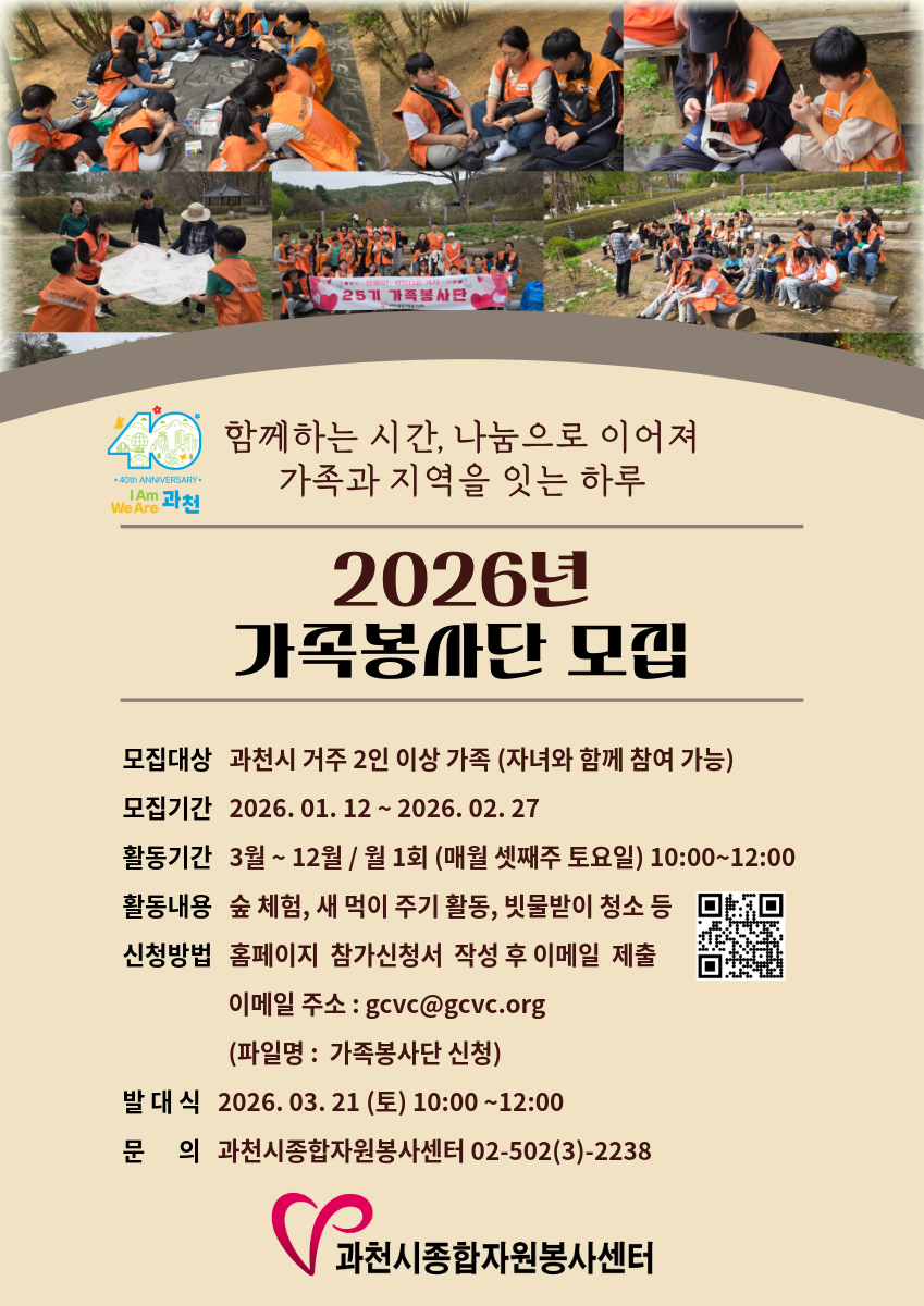 2. 제목: 가족봉사단 모집 시간: 09:00 ~ 22:00 장소: 과천시자원봉사센터