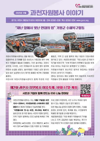 %uacbd%uae30%ub3c4 %uacfc%ucc9c%uc2dc %ubcc4%uc591%uc0c1%uac001%ub85c10 %uacfc%ucc9c%ud0c0%uc6cc 3%uce35 %uc804%ud654 02)502-2238 %ud329%uc2a4 02)502-2234 www.gcvc.org2025%ub144 9%uc6d4 %uacfc%ucc9c%uc790%uc6d0%ubd09%uc0ac %uc774%uc57c%uae30%uacfc%ucc9c%uc2dc%uc790%uc6d0%ubd09%uc0ac%uc13c%ud130%ub294 8%uc6d4 8%uc77c(%uae08), %uc9d1%uc911%ud638%uc6b0%ub85c %ud070 %ud53c%ud574%ub97c %uc785%uc740 %uce5c%uc120%ub3c4%uc2dc %uac00%ud3c9%uad70%uc744 %ucc3e%uc544 %uc218%ud574 %ubcf5%uad6c %uc790%uc6d0%ubd09%uc0ac %ud65c%ub3d9%uc744 %uc9c4%ud589%ud588%ub2e4. %uc774%ubc88 %ubd09%uc0ac%uc5d0%ub294 %uacfc%ucc9c%uc2dc %uacf5%ubb34%uc6d0, %uc2dc%uc758%uc6d0, %uc2dc%ubbfc %uc790%uc6d0%ubd09%uc0ac%uc790 %ub4f1 80%uc5ec %uba85%uc774 %ucc38%uc5ec%ud574 %ub530%ub73b%ud55c %uc190%uae38%uc744 %ubcf4%ud0f0%ub2e4. %ubd09%uc0ac%uc790%ub4e4%uc740 %uac00%ud3c9%uad70 %uc0c1%uba74 %ud56d%uc0ac%ub9ac %uc77c%ub300 %uce68%uc218 %ub18d%uc7a5%uc5d0%uc11c %ud1a0%uc0ac %uc81c%uac70%uc640 %ud1b5%ud589%ub85c %ubcf5%uad6c%uc5d0 %uad6c%uc2ac%ub540%uc744 %ud758%ub838%ub2e4.%uacfc%ucc9c%uc2dc%uc640 %uacfc%ucc9c%uc2dc%uc790%uc6d0%ubd09%uc0ac%uc13c%ud130%uac00 %ud568%uaed8 %uc8fc%uad00%ud55c %uc774%ubc88 %ud65c%ub3d9%uc740, %uc9c0%uc5ed %uac04 %uc0c1%uc0dd %ud611%ub825%uacfc %uc7ac%ub09c %ub300%uc751%uc758 %ubaa8%ubc94%uc0ac%ub840%ub85c %ud3c9%uac00%ubc1b%uace0 %uc788%ub2e4. %ucd5c%uc724%uc601 %uc13c%ud130%uc7a5%uc740%u201c%uc791%uc740 %uc190%uae38%uc774 %ud070 %uc704%ub85c%uac00 %ub418%uae30%ub97c %ubc14%ub780%ub2e4%u201d%uba70%u201c%uc218%ud574 %uc8fc%ubbfc%ub4e4%uc774 %ud558%ub8e8%ube68%ub9ac %uc77c%uc0c1%uc744 %ud68c%ubcf5%ud558%uae38 %ubc14%ub77c%ub294 %ub9c8%uc74c%uc73c%ub85c %ud568%uaed8%ud588%ub2e4%u201d%uace0 %uc804%ud588%ub2e4.%uc790%uc6d0%ubd09%uc0ac%uc790%ub4e4%uc758 %ud5cc%uc2e0%uc801%uc778 %ucc38%uc5ec%ub85c %ud604%uc7a5%uc5d0%ub294 %ub530%ub73b%ud55c %uc5f0%ub300%uc758 %ubd84%uc704%uae30%uac00 %uac00%ub4dd%ud588%ub2e4.%uc13c%ud130%ub294 %uc55e%uc73c%ub85c%ub3c4 %uc7ac%ub09c %uc0c1%ud669%uc5d0 %uc801%uadf9 %ub300%uc751%ud558%uba70 %uc9c0%uc18d%uc801%uc778 %uc790%uc6d0%ubd09%uc0ac %uc5f0%ub300 %ud65c%ub3d9%uc744 %uc774%uc5b4%uac08 %uacc4%ud68d%uc774%ub2e4.%u201c%uc7ac%ub09c %uc55e%uc5d0%uc11c %ube5b%ub09c %uc5f0%ub300%uc758 %ud798%u201d %uac00%ud3c9%uad70 %uc218%ud574%ubcf5%uad6c%ud65c%ub3d91%uacfc%ucc9c%uc2dc%uc790%uc6d0%ubd09%uc0ac%uc13c%ud130%ub294 %uc624%ub294 10%uc6d4 17%uc77c(%uae08) %uc624%uc804 10%uc2dc~%uc624%ud6c44%uc2dc, %uc9c0%uc2dd%uc815%ubcf4%ud0c0%uc6b4 %uc2a4%ub9c8%ud2b8%ucf00%uc774 %uc36c%ud070%uad11%uc7a5%uc5d0%uc11c %uc81c2%ud68c %uc790%uc6d0%ubd09%uc0ac %uc774%uc74c%ucd95%uc81c%ub97c %uc5f0%ub2e4. %u2018%uc790%uc6d0%ubd09%uc0ac%ub85c %uc787-%ub294 %uacfc%ucc9c, %ud558%ub098%ub418%ub294 %ucd95%uc81c%u2019%ub97c %uc2ac%ub85c%uac74%uc73c%ub85c %ud55c %uc774%ubc88 %ud589%uc0ac%ub294 %uc2dc%ubbfc%uacfc %uc9c0%uc815%ud0c0 %uc785%uc8fc%ubbfc, %uc9c0%uc5ed %uae30%uc5c5%uc774 %ud568%uaed8%ud558%ub294 ESG %uc2e4%ucc9c%ud615 %ucd95%uc81c%ub85c %uae30%ud68d%ub410%ub2e4.%ucd95%uc81c%uc7a5%uc5d0%ub294 %u25b2%ud0c4%uc18c%uc911%ub9bd%u00b7ESG %uccb4%ud5d8%ubd80%uc2a4 %u25b2%uc544%ub098%ubc14%ub2e4 %uc7a5%ud130 %u25b2%uc790%uc6d0%ubd09%uc0ac %uc778%uc99d %uc774%ubca4%ud2b8 %ub4f1 %ub2e4%ucc44%ub85c%uc6b4 %ud504%ub85c%uadf8%ub7a8%uc774 %ub9c8%ub828%ub418%uba70, %uc2dc%ubbfc %ub204%uad6c%ub098 %ubb34%ub8cc%ub85c %ucc38%uc5ec%ud560 %uc218 %uc788%ub294 %uccb4%ud5d8%uacfc %ub098%ub214%uc758 %uc7a5%uc774 %uc5f4%ub9b0%ub2e4. %ub610%ud55c %uc7ac%ub2a5%ub098%ub214 %uacf5%uc5f0%uacfc %ub2e4%uc591%ud55c %uae5c%uc9dd %uc774%ubca4%ud2b8, %uae30%ub150%ud488 %uc99d%uc815%ub3c4 %uc900%ube44%ub3fc %uc788%uc5b4, %ucd95%uc81c%ub97c %ucc3e%ub294 %uc2dc%ubbfc%ub4e4%uc5d0%uac8c %ud2b9%ubcc4%ud55c %uc990%uac70%uc6c0%uc744 %uc120%uc0ac%ud560 %uc608%uc815%uc774%ub2e4.%ucd5c%uc724%uc601%uc13c%ud130%uc7a5%uc740%u201c%uc774%ubc88 %ucd95%uc81c%uac00 %uc790%uc6d0%ubd09%uc0ac%uc758 %uac00%uce58%ub97c %ub098%ub204%uace0 %uc9c0%uc5ed %uacf5%ub3d9%uccb4%uc758 %ud798%uc744 %ud655%uc7a5%ud558%ub294 %uacc4%uae30%uac00 %ub418%uae38 %ubc14%ub780%ub2e4%u201d%uba70 %uc2dc%ubbfc%ub4e4%uc758 %ub9ce%uc740 %ucc38%uc5ec%ub97c %uc694%uccad%ud588%ub2e4.%uc2dc%ubbfc%uacfc %uae30%uc5c5%uc774 %ud568%uaed8 %ub9cc%ub4dc%ub294 ESG %ub098%ub214 %ud55c%ub9c8%ub2f9%uc81c2%ud68c %uacfc%ucc9c%uc2dc %uc790%uc6d0%ubd09%uc0ac %uc774%uc74c%ucd95%uc81c, 10%uc6d4 17%uc77c %uac1c%ucd5c%ucd95%uc81c%uc548%ub0b4