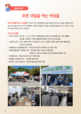 %ud478%ub978 %ub0b4%uc77c%uc744 %uc5ec%ub294 %uc5ec%uc131%ub4e4%uc740 %uc790%uc5f0%uacfc %uc778%uac04%uc758 %uc0dd%uba85%uc874%uc911%uc0ac%uc0c1%uc744 %ubc14%ud0d5%uc73c%ub85c %ubd09%uc0ac%uc640 %ub098%ub214%uc744 %uc2e4%ucc9c%ud568%uc73c%ub85c%uc11c %uc131%uc219%ud55c %uc778%uc131%uc744 %ud0a4%uc6b0%uba70 %ub098%uc544%uac00 %ud68c%uc6d0%ub4e4%uc758 %uc790%ubc1c%uc801%uc778 %ud65c%ub3d9%uc73c%ub85c %uc0dd%ud65c %uc18d %ud658%uacbd%ubcf4%uc804%uc6b4%ub3d9%uacfc %uc9c0%uc18d %uac00%ub2a5%ud55c %uc9c0%uad6c%ud658%uacbd %uc720%uc9c0%ub97c %uc0ac%uba85%uc73c%ub85c %ud558%ub294 %ub2e8%uccb4%uc774%ub2e4.%ud478%ub978 %ub0b4%uc77c%uc744 %uc5ec%ub294 %uc5ec%uc131%ub4e4%ub2e8%uccb4 %uc18c%uac1c%uc8fc%uc694 %uc815%uae30 %ud65c%ub3d9%u25cf %ub179%uc0c9%uac00%uac8c %uc6b4%uc601 : %uc6d4~%uae08 11-16%uc2dc, %uc9c0%uc5ed%ub0b4 %uc790%uc6d0%uc808%uac10%ud615%uc758 %uc0c8%ub85c%uc6b4 %uc18c%ube44 %ubb38%ud654%ub97c %ucd09%uc9c4, %uc790%uc6d0 %uc7ac%ud65c%uc6a9 %ud6a8%uacfc%ub97c %uadf9%ub300%ud654%ud558%uae30 %uc704%ud558%uc5ec %ubb3c%ubb3c%uad50%ud658 %ud615%ud0dc%uc758 %ub179%uc0c9%uac00%uac8c %uc0c1%uc124 %uc6b4%uc601%u25cf %ub098%ub214%uc7a5%ud130 %uc6b4%uc601 : 3%uc6d4~10%uc6d4 %ub9c8%uc9c0%ub9c9 %uc8fc %ud1a0%uc694%uc77c(10-15%uc2dc) %uc2dc%ubbfc%ub4e4%uc758 %uc790%uc728%uc801 %ucc38%uc5ec%uc758 %uc7a5%uc778 %ubb3c%ubb3c%uad50%ud658, %uc544%ub098%ubc14%ub2e4 %uc7a5%ud130 %uc6b4%uc601%u25cf %uad50%ubcf5%ubb3c%ub824%uc785%uae30 %ud589%uc0ac(%uc878%uc5c5%uc2dc%uc98c) : %uacfc%ucc9c %uad00%ub0b4 %ud559%uad50%uc758 %uad50%ubcf5 %ubb3c%ub824 %uc785%uae30 %ud589%uc0ac %uac1c%ucd5c%u25cf %uce5c%ud658%uacbd%uc81c%ud488%ub9cc%ub4e4%uae30 %uccb4%ud5d8(%uc6d4 2%ud68c) : %ucc9c%uc5f0%uc81c%ud488 %ub9cc%ub4e4%uae30 %uad50%uc721 %ubc0f %uccb4%ud5d8 %uc6b4%uc601 (%ucc9c%uc5f0%ube44%ub204, %ucc9c%uc5f0 %ubaa8%uae30%ud1f4%uce58%uc81c, %ucc9c%uc5f0 %uc0b4%uade0%ud0c8%ucde8%uc81c %ub9cc%ub4e4%uae30 %ub4f1)%u25cf %uae30%ubd80%ubb38%ud654%uc0ac%uc5c5 : %uc5f0%ub9d0 %uad00%ub0b4 %ubcf5%uc9c0%uae30%uad00 %uae30%ubd80%uae08 %uc804%ub2ec%u25cf %uc81c%ub85c%uc6e8%uc774%uc2a4%ud2b8%uc20d(%uc624%uc544%ub974) : %uc9c0%uc790%uccb4%uc640 %uacf5%ub3d9 %uc6b4%uc601%u25cf %ud3d0%uac74%uc804%uc9c0 %uad50%ud658 %uc0ac%uc5c5(%uc0c1%uc2dc) : %ud3d0%uac74%uc804%uc9c0%ub97c %uc0c8%uac74%uc804%uc9c0%ub85c %uad50%ud6584