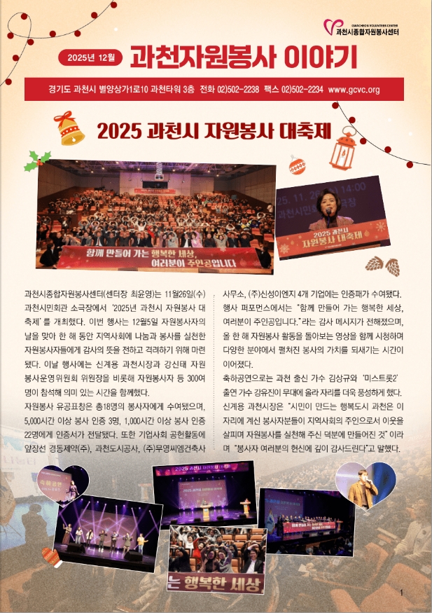1. 제목: 제설봉사(발생시) 시간: 09:00 ~ 22:00 장소: 과천지역